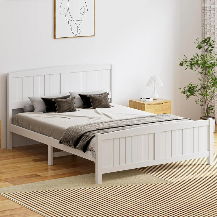 XMSJ Queen Bed Frame White Pine Wood - Platform Bed with Headboard & Footboard